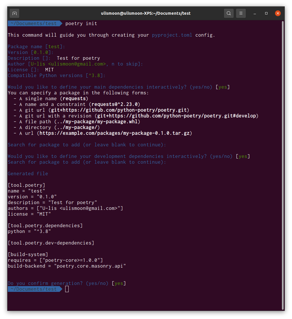 일단 poetry 를 사용하면서 가장 편안해지는 점은 위에서 말한 것처럼 패키지를 목적에 따라 나누어 관리할 수도 있고, 의존성을 lock file 을 통해 완전하게 재현할 수 있다는 것에 있다. 어떤 식으로 쓸 수 있는지 보자. 먼저 poetry 를 설치하고, 사용하고자 하는 폴더에 가서 poetry init 으로 초기화를 한다. 마치 package.json 을 만들듯이 이름도 물어보고 버전도 물어보고 라이선스도 물어본다.