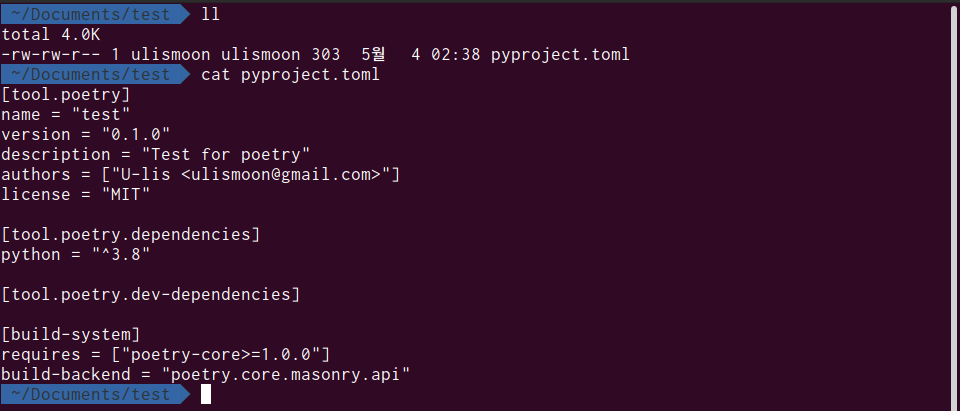 init 이 완료되면 pyproject.toml 이라는 파일이 생성된다. package.json 의 작은 불편함이 바로 json 이어서 주석을 달거나 조작을 하기 까다롭다는 점인데, poetry 에서는 toml 을 사용하고 있기 때문에 이런 점에서는 JS 보다 더 사용하기가 용이하다.
